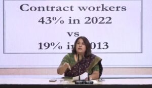 सुप्रिया श्रीनेत ने कहा कि आर्थिक कुप्रबन्धन, नोटबन्दी, आधे-अधूरे जीऐसटी और अकुशल कोविड-प्रबन्धन जैसी नीतियों के कारण अर्थव्यवस्था को 11.5 लाख करोड़ रुपये का नुक़सान हुआ। सुप्रिया ने कहा कि देश में 1.5 करोड़ से ज्यादा नौकरियां ख़त्म हो गईं। उन्होंने कहा कि ठेका और संविदा पर काम करने वाले कर्मचारियों की हिस्सेदारी 2013 में 19 प्रतिशत से बढ़कर 2022 में 43 प्रतिशत हो गई, लेकिन नरेंद्र मोदी कह रहे हैं कि उन्होंने आठ करोड़ रोज़गार दिए। सुप्रिया श्रीनेत ने कहा कि आख़िर कहाँ हैं ये नौकरियां!